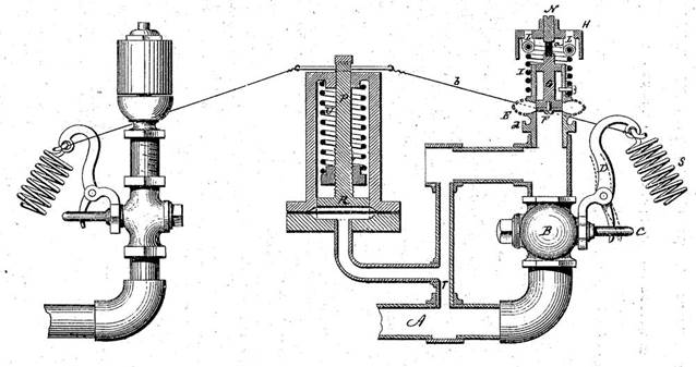 При разработке конструкций систем пожаротушения зданий и кораблей впервые было применено основное свойство спринклерной системы – автоматическая активация во время пожара. Открытие управляющих клапанов или распылительных отверстий в трубах производилось в результате расплавления пробок, выполненных из гуттаперчи, лекгоплавкого металла или других составов, например смеси воска, резины и стеарина, которые плавились при необходимой температуре. В некоторых патентах предлагались схемы с управлением клапанами с помощью веревок, которые сгорали в огне и автоматически открывали секционные клапаны (рис.1.3).